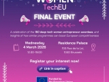 Afaemme is pleased to announce that the Women TECHEU Final Event will take place on 4 March 2026 in Brussels. This Event will bring together the winners, partners, and stakeholders to reflect on the achievements of the programme, share insights, and celebrate the impact of women-led deep tech across Europe.partner at the Women TechEU is a 2-year EU-funded project supporting women leading deep tech startup companies from Europe. Our mission is to create a more gender-balanced entrepreneurship ecosystem. We believe that diversity drives innovation, and we are here to provide women in deep tech with more opportunities, resources, and support to thrive. The project consortium was launched in 4 calls for applications over the span of 2 years which, following a rigorous evaluation process, will result in a total of 160 beneficiaries. Each beneficiary received €75k grants (non-dilutive finance) as well as a personalised business development programme which includes mentoring, coaching and targeted training among other options.