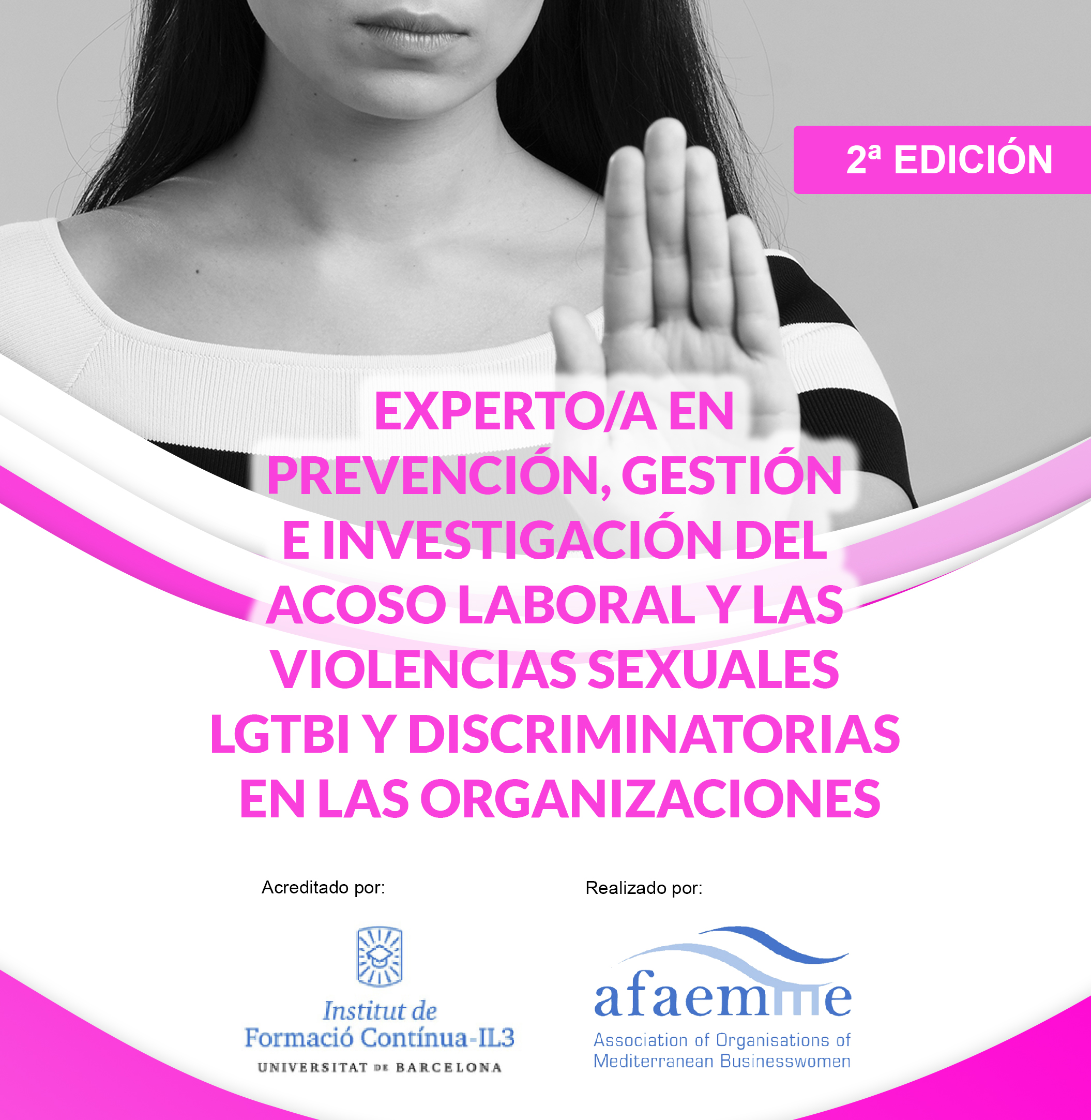 Esta formación tiene como objetivo principal formar personas especializadas en la prevención, detección, investigación e intervención frente a situaciones de acoso laboral, con especial atención a las violencias y discriminaciones por género, orientación sexual e identidad de género y otras discriminaciones. Titulación de Postgrado Experto/a. Es una formación online, "a tú ritmo", en 20 semanas. Con nuestra metologia "Afaemme" muy dinámica e interactiva. ¡Aprendes mientras practicas! ¿Quieres apuntarte? __________________
